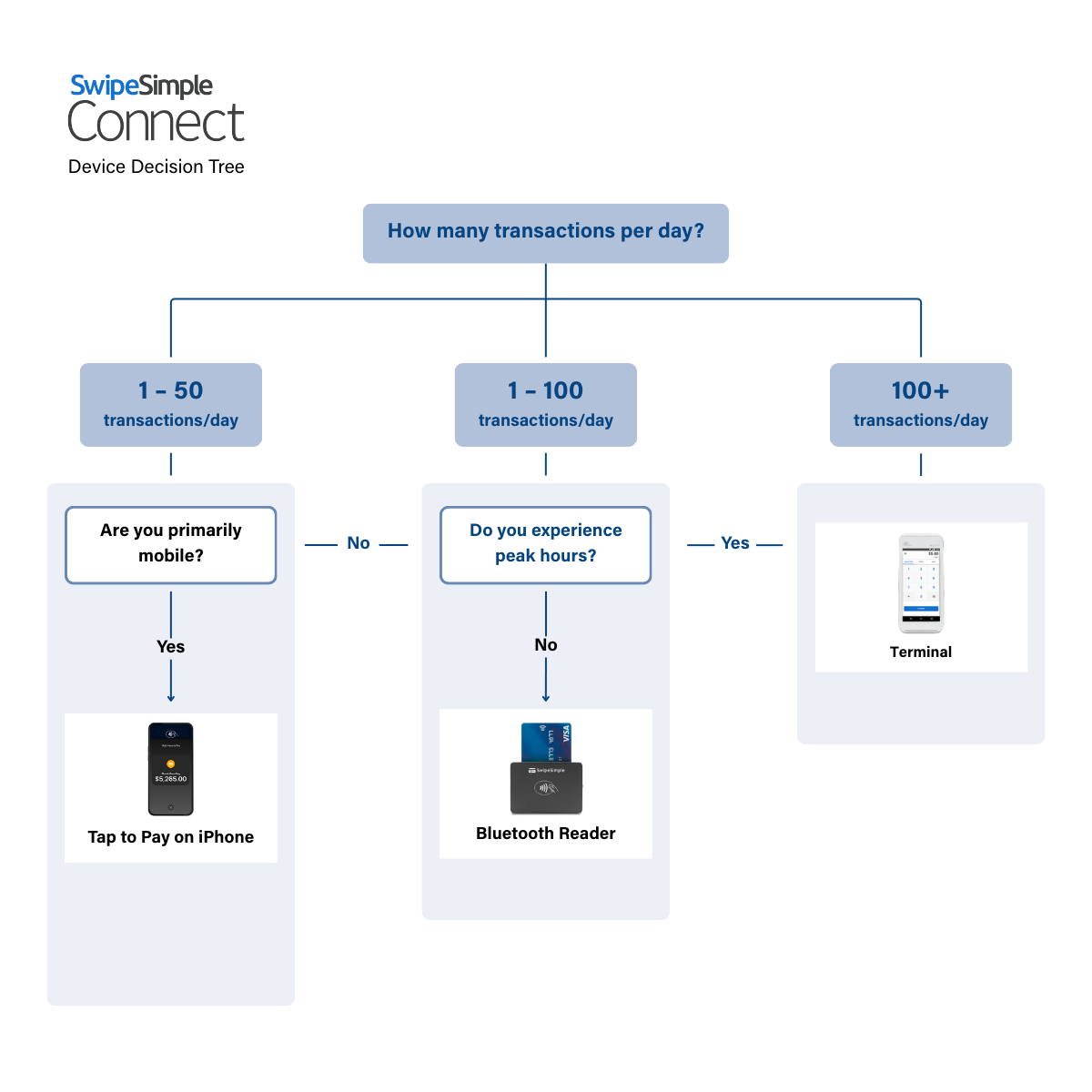 SwipeSimple Connect offers card readers and countertop terminals alongside Tap to Pay on iPhone, giving you flexibility as your business grows or your needs change. You're not locked into a single payment method or forced to use only one device type. We work with your business model, not against it.
